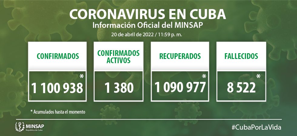 Del millón 100 mil 938 de pacientes diagnosticados con la enfermedad, se mantienen ingresados mil 380, de ellos mil 356 con evolución clínica estable. Se acumulan 8 mil 522 fallecidos (no se reportan fallecidos en el día), letalidad de 0.77% vs 1,22% en el mundo y 1,78% en Las Américas; dos evacuados, 57 retornados a sus países, en el día hubo 326 altas, se acumulan 1 millón 090 mil 977 (99,1%). Se atienden en las terapias intensivas 24 pacientes confirmados de ellos 14 críticos y 10 graves.
