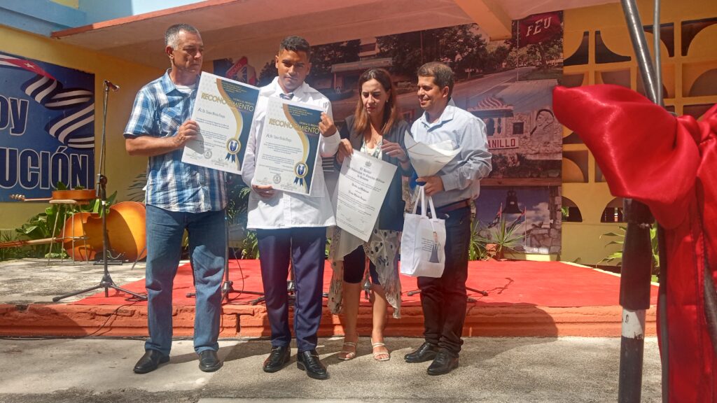 Recibe el título de manos de Luis Manuel Pérez Concepción jefe de inspecciones del Ministerio de Salud Pública de Cuba, la Máster en Ciencias Doctora Madelaine González Broche, rectora de la Universidad Médica de Granma, y José Luis Vega Pérez, vicegobernador en la provincia Granma // Foto: Marlene Herrera